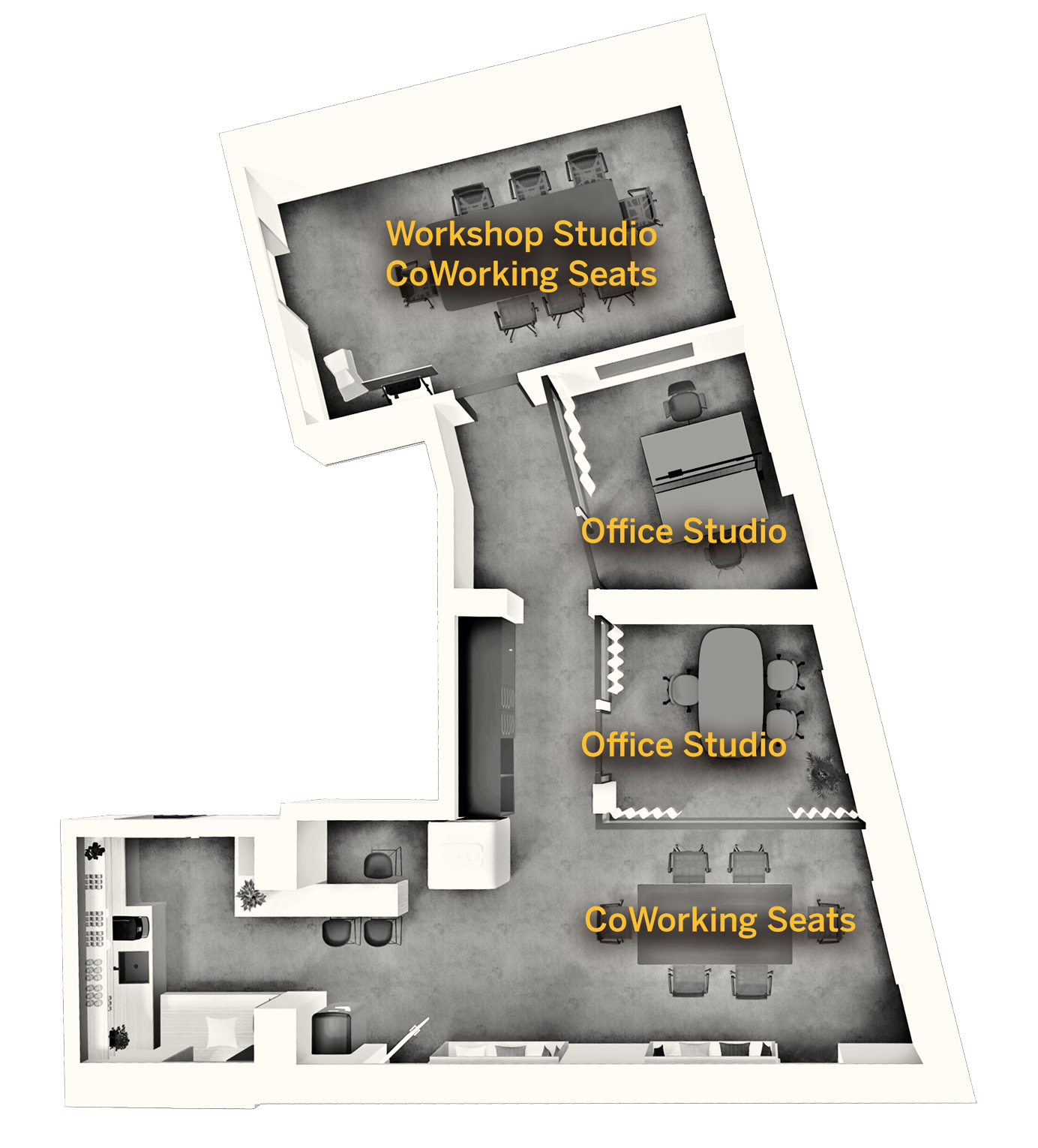 Flexible Co-Working-Plätze, zwei private Büroräumen, sowie ein großer Besprechungs- und Workshopraum für bis zu 10 Personen bieten dir optimale Bedingungen, um produktiv zu arbeiten und dich mit anderen auszutauschen.